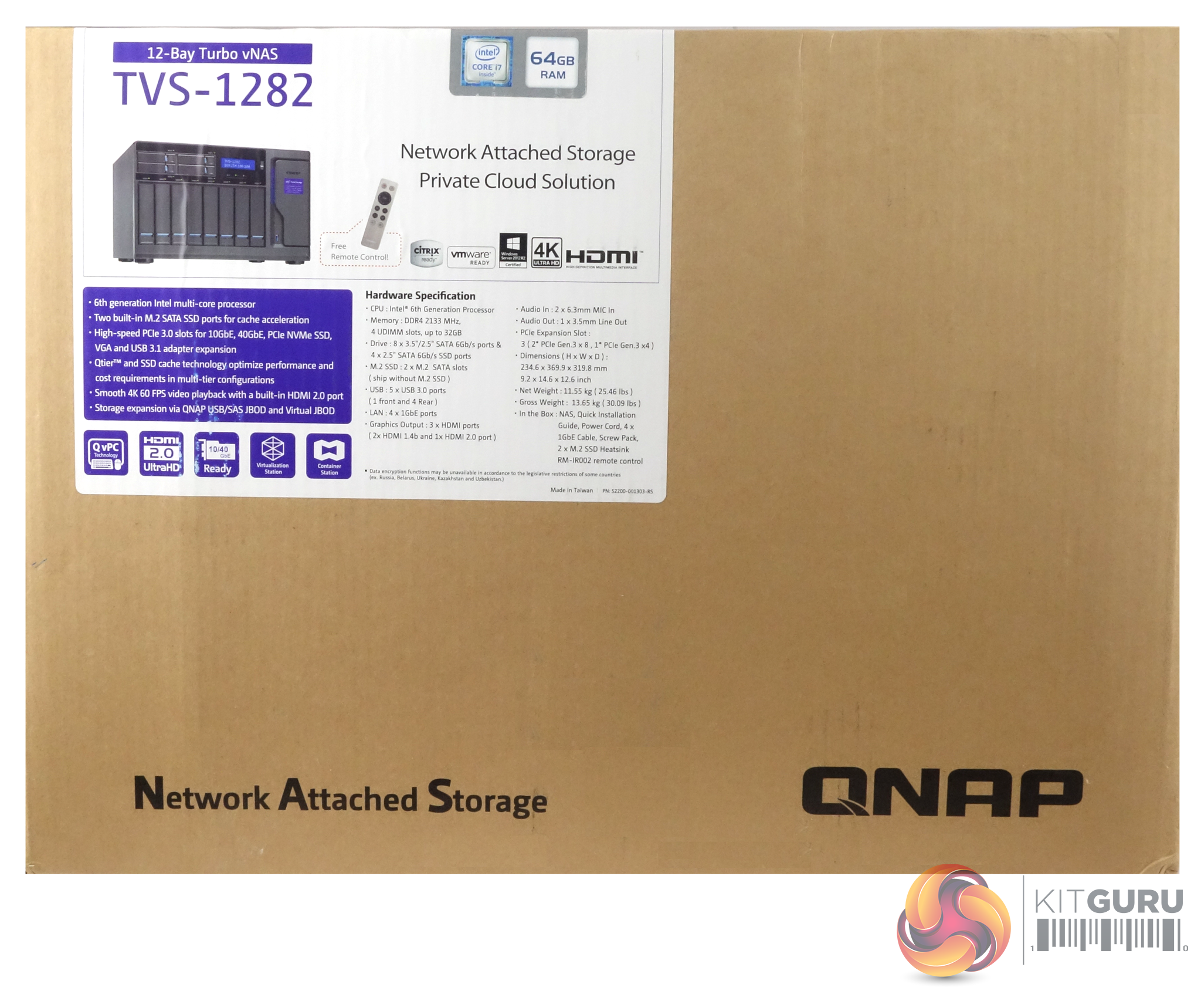 The TVS-1282 comes in a large box with a small but clear image of the unit on the front. Under the image are two information panels, the left hand one lists some of the NAS features while the one on the right displays the hardware specification.