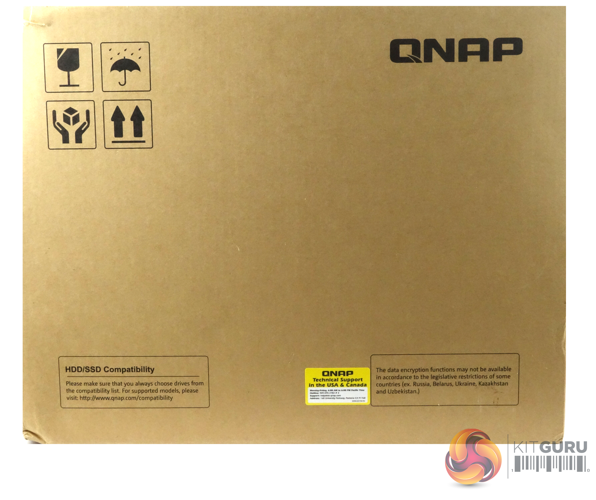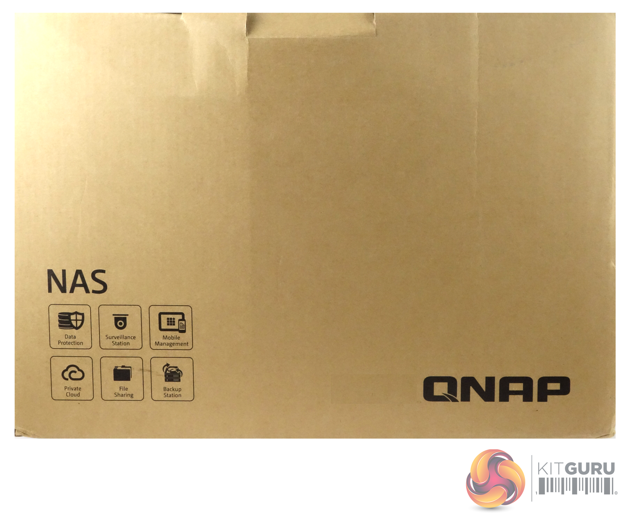 The rear of the box has a group of icons in the bottom left hand corner representing some of the QTS OS features; Data Protection, Surveillance Station, Mobile Management, Private Cloud, File Sharing and Backup Station.