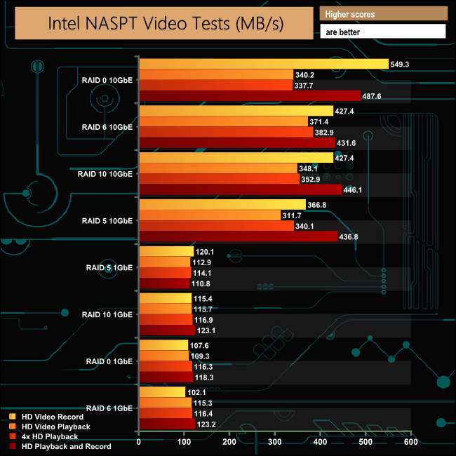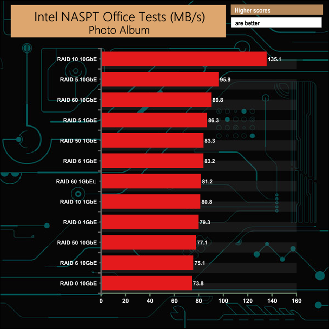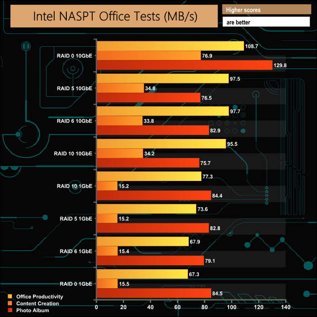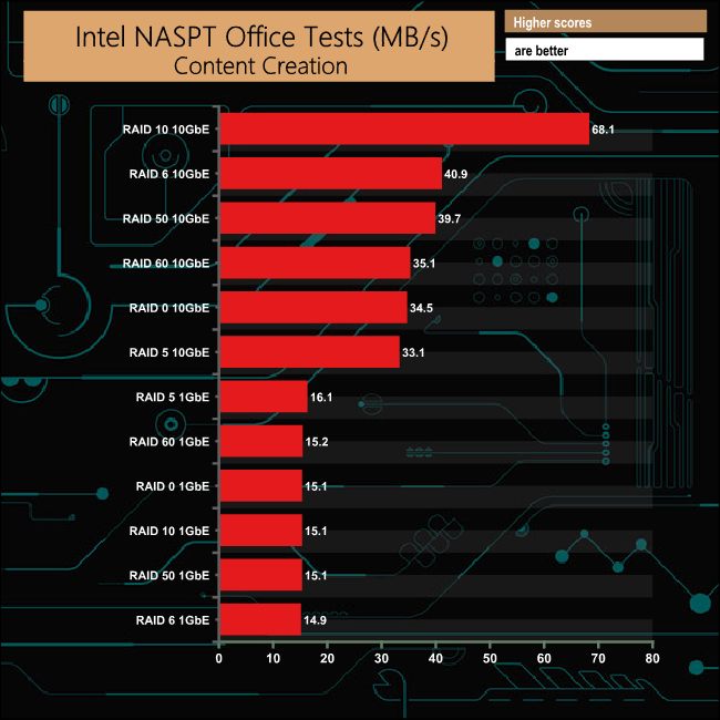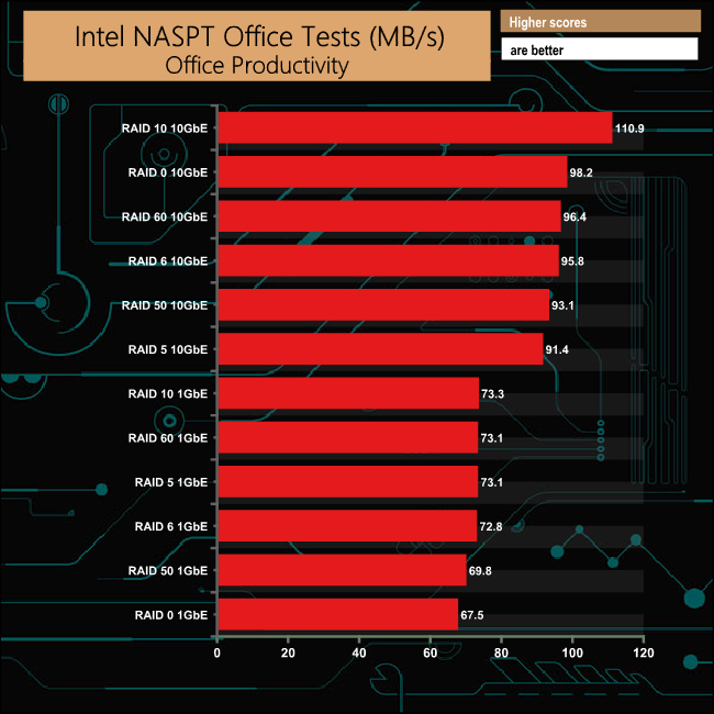 In the NASPT Office tests, the fastest speeds came when the drives were in a RAID 10 array with a 10GbE connection.