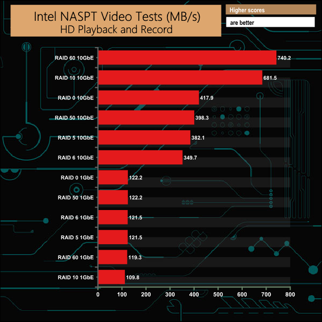 In the four Video tests of Intel's NASPT we used, the performance with the drives built into RAIDs 10 and 60 using a 10GbE connection was very, very impressive. The fastest figures for the two arrays came in the HD Video Playback test with 941MB/s in RAID 60 and 929MB/s in RAID 10. With a 1GbE connection the performance across the arrays is very consistent.