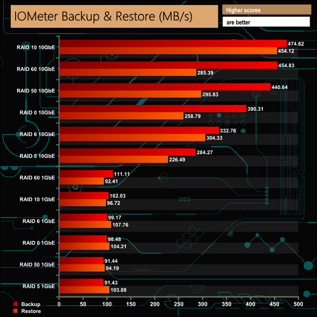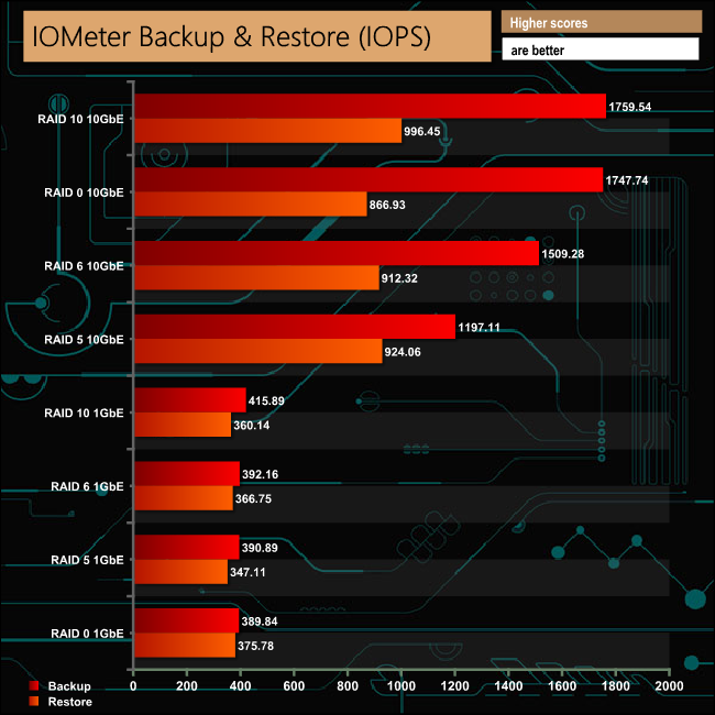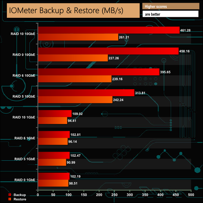 Our backup and restore test were dealt with quickly and efficiently in all the tested HDD arrays and at both connection speeds.