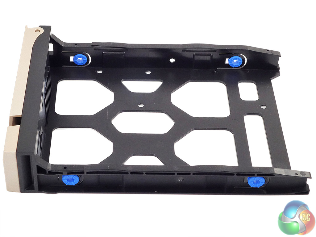 The four drive trays are tool free, each using a pair of press in plastic retaining bars, the pins of which sit through the screw holes in the side of the tray and into the mounting holes in the side of a drive, a simple but effective design. The mounting holes also have grommets to aid in damping down drive vibration. The bottom of the trays have screw holes for mounting 2.5in drives.