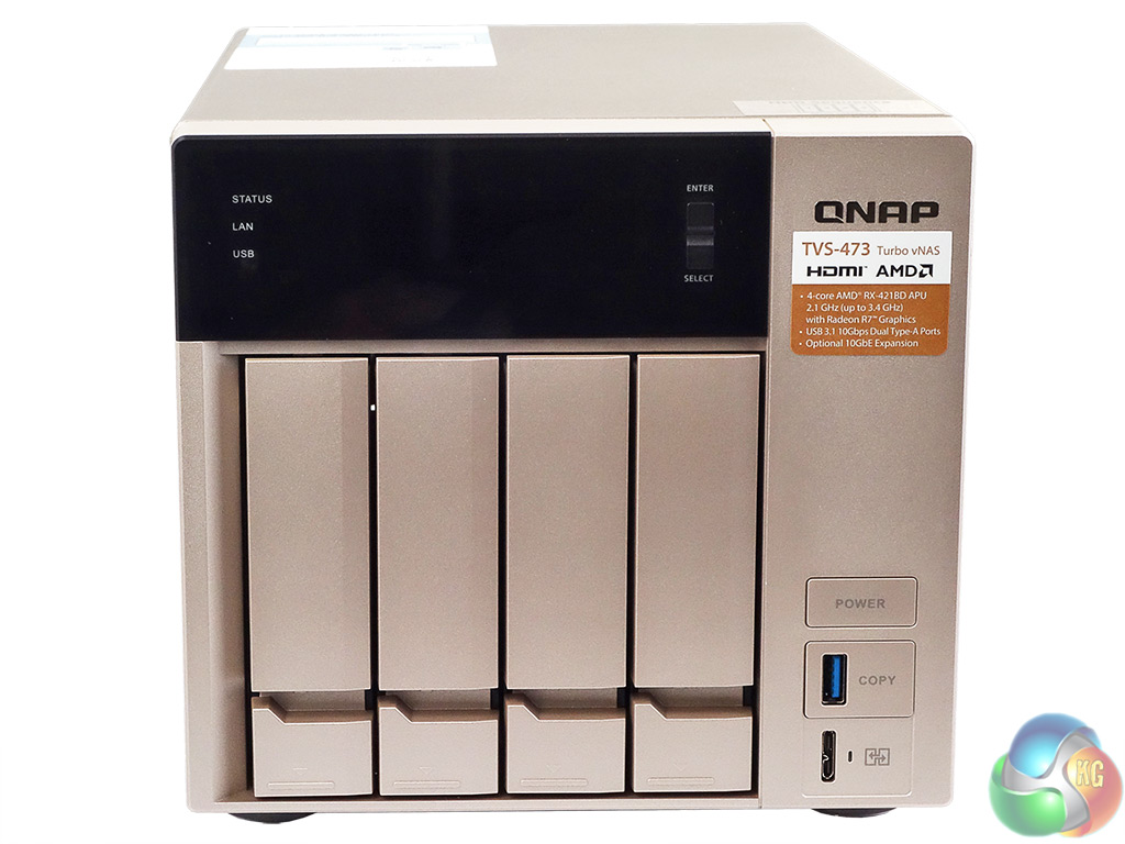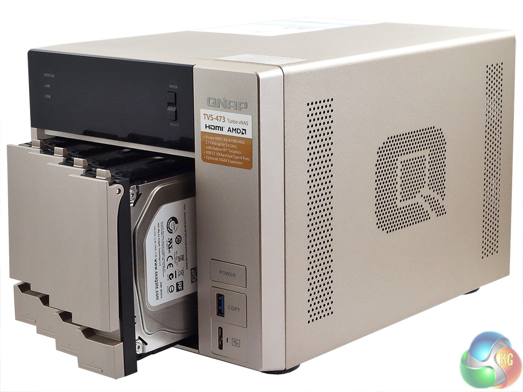 QNAP's TVS-473-16G is of a tower design with front, vertically mounted drive bays. The cover and chassis are constructed from a good quality metal and the unit is finished off in an attractive Champagne Gold colour. The front bezel is made from a decent plastic and also gold coloured.