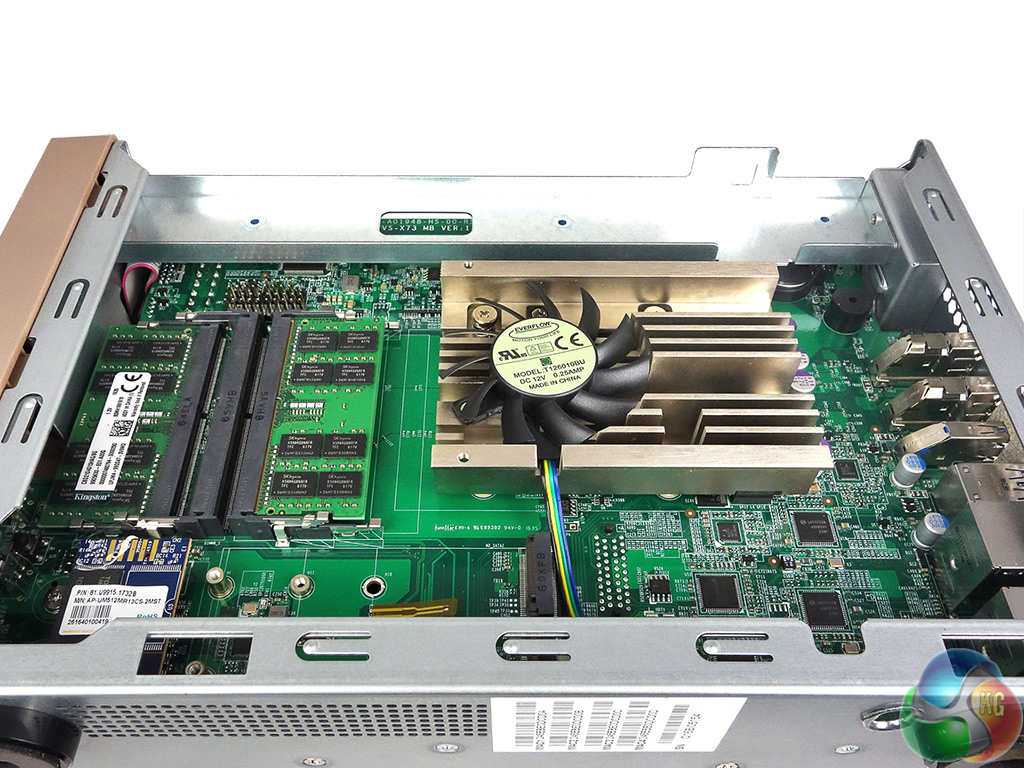 Getting access to the four DDR4 SO-DIMM slots and the two M.2 SATA ports is as simple as undoing the three small screws in the rear of the unit that holds the outer cover on. Once the cover is off you are confronted by a lot more hardware than we would consider normal for a 4-bay NAS.