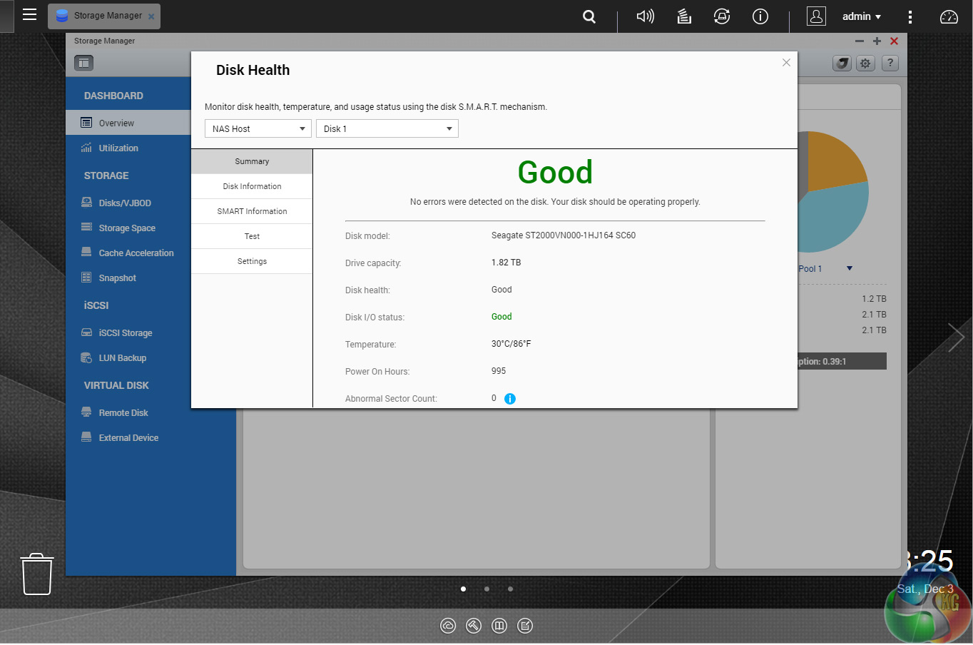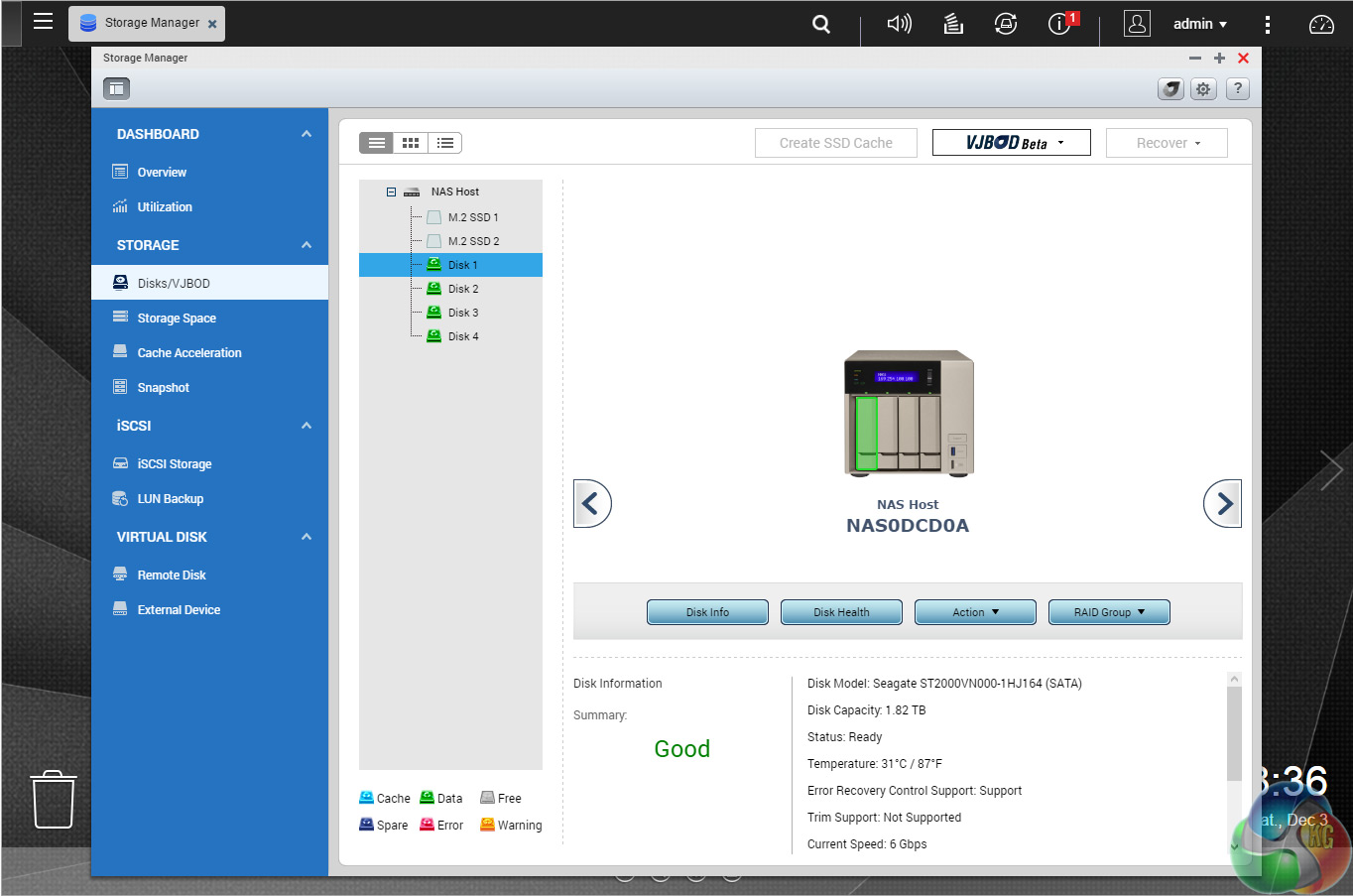 Storage Manager gives you complete control over setting up drives and volumes, in addition to showing how the capacity of the NAS is being used and warnings of potential failures. The Storage/Disks/VJBOD sub-menu displays individual drive information and health with a handy graphical display showing which drive is being interrogated.