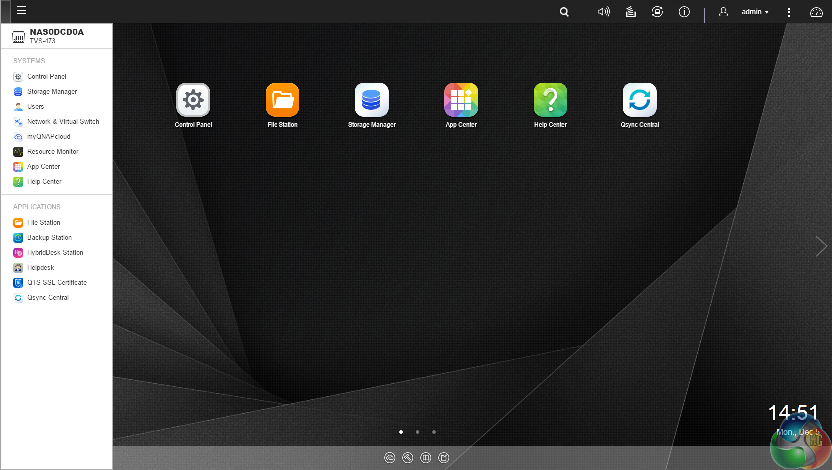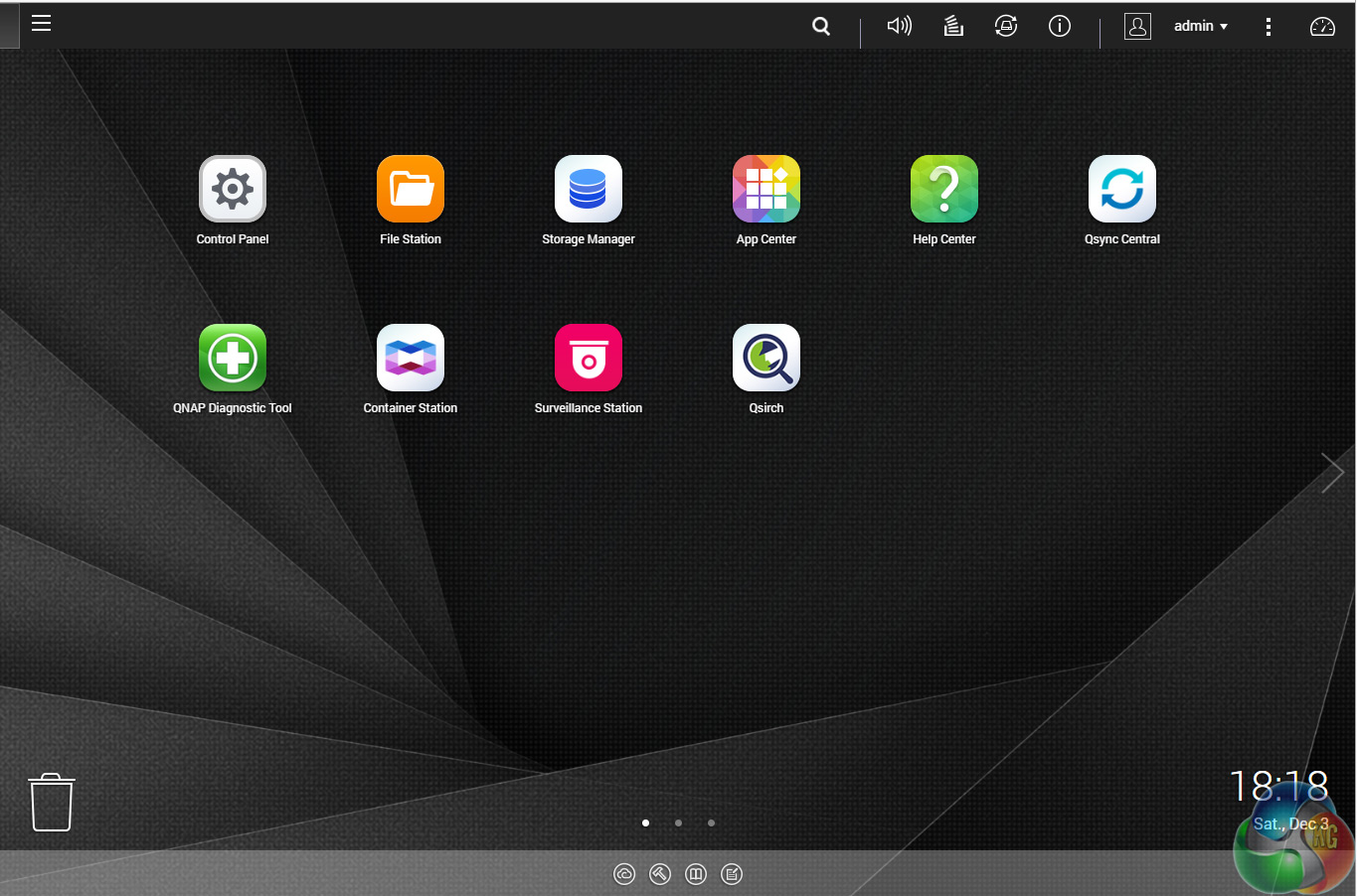 QTS is a graphically-rich OS with the major apps appearing as icons on the main page. Clicking on the ‘hamburger‘ menu icon at the top left-hand side of the screen drops down a very useful side menu. Clicking the icon on the top right of the screen activates the Dashboard page which gives a snapshot of what’s happening with the NAS.