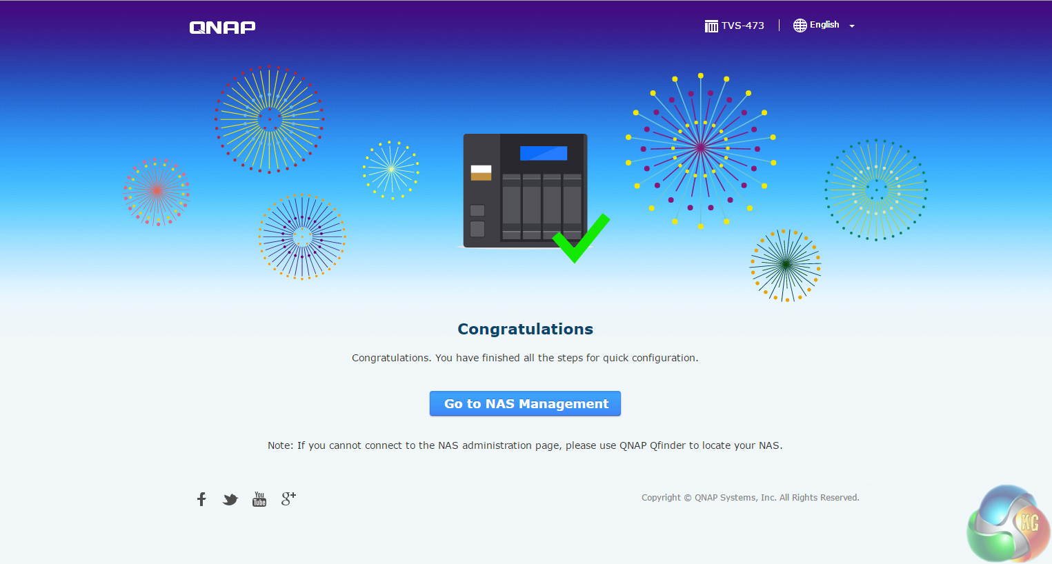 The default setup for the TVS-473-16G with four disks is RAID 5. It takes around 20 minutes to get the NAS set up and ready to use but obviously longer to get the disks synchronised. Once the NAS is set up, clicking on the NAS in the QFinder Pro brings up the log in screen.