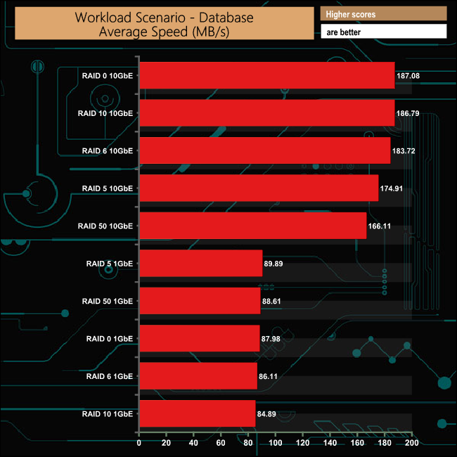 As with the File Server test, in the Workstation test the 1GbE performance is very consistent across the arrays at an average of 87.29MB/s. With a 10GbE connection, the average across the arrays is 179.72MB/s.