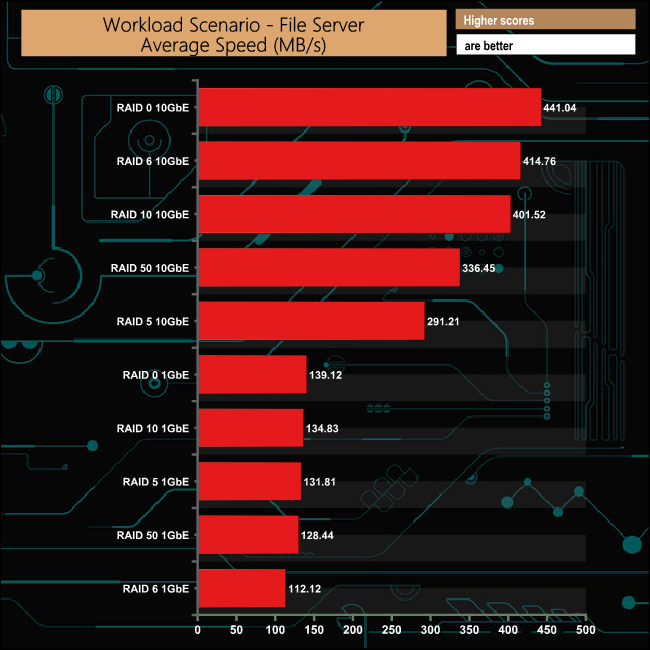 In the File Server workload test over a 1GbE connection, the TVS-673e shows excellent consistency across all the arrays with the exception of the RAID 6 performance where the performance dropped off quite sharply. Needless to say, the 10GbE performance is mightily impressive.
