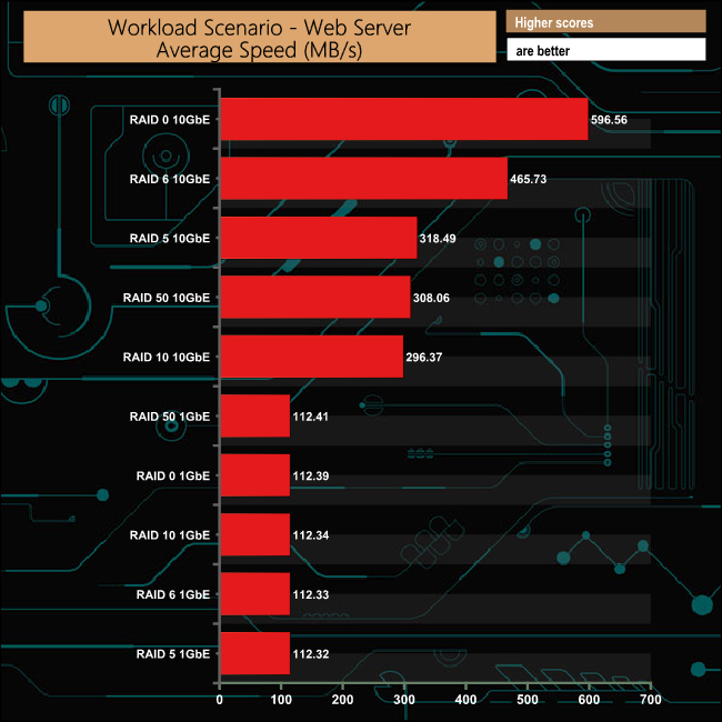 As with the File Server test, in the Web Server test the 1GbE performance is very consistent across the arrays at 112GB/s. Taking the RAID 0 result of the equation, the RAID 6 performance in this test when using a 10GbE connection is stunning.