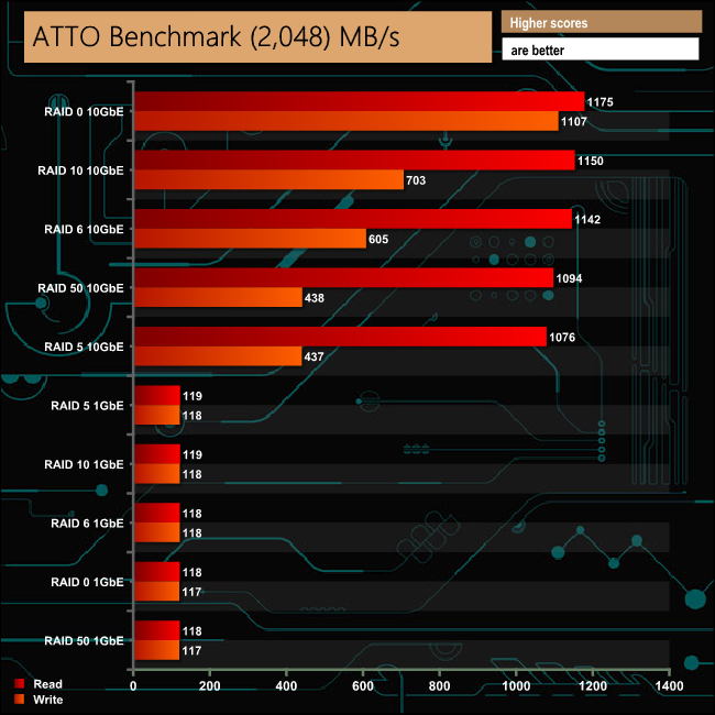However tested over a 10GbE connection, the peak sequential speed we got from the unit was 1175MB/s for reads in RAID 0 with the peak write performance of 1107 MB/s also coming when the drives were built into a RAID 0 array.