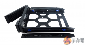 The 3.5in drive trays are tool-free. A plastic strip fits into the side rails with a pin at either end that goes through the corresponding holes in the rail sides. These pins then lock into the screw holes on the drive’s side – simple but effective. If you want to make sure the drives don’t move, then QNAP has supplied enough screws (3 per drive) to fix them in place. The holes in the tray sides have rubber vibration-reducing grommets fitted. The trays support 2.5in drives and the only way to fix them is to use the bundled screws (24) to go through the bottom of the tray into the drive.