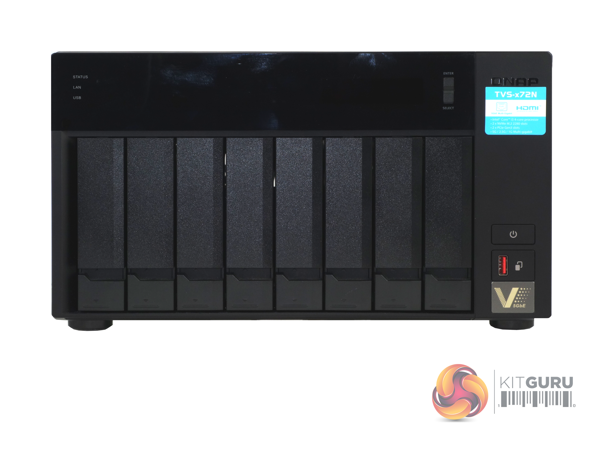 The TVS-872N is a compact tower NAS with a metal chassis supporting eight vertically mounted drive bays. Above the drive bays is a smoked plastic panel that is home to a monochrome backlit LCD display with Enter and Select buttons. The panel allows you to power on and off the NAS, view and configure network TCP/IP settings and displays warning messages if there is a problem with the NAS. Usefully, the LCD display can also display information about the NAS drives and volumes.