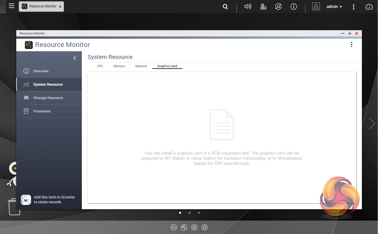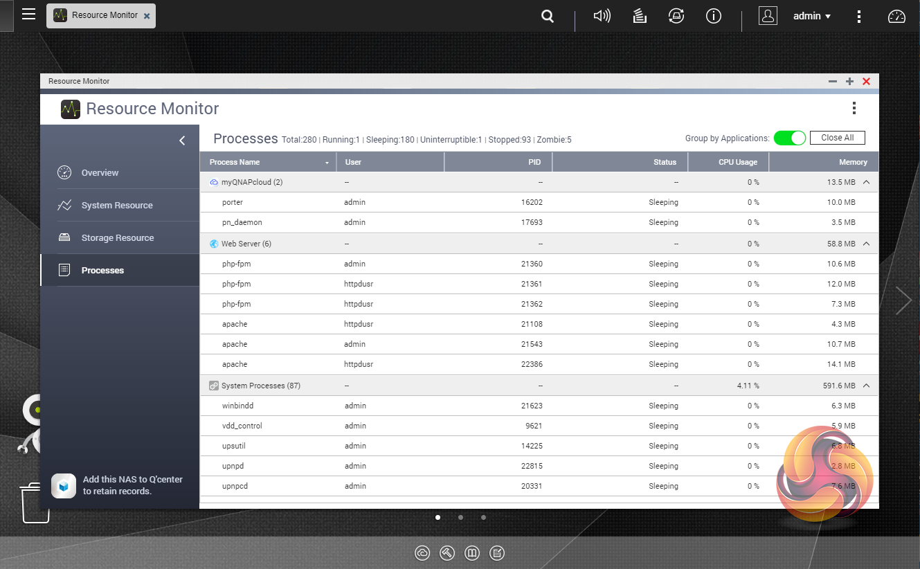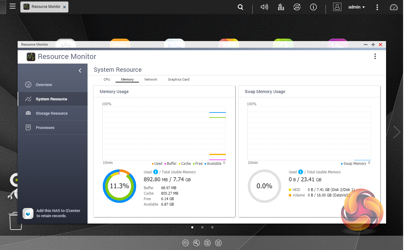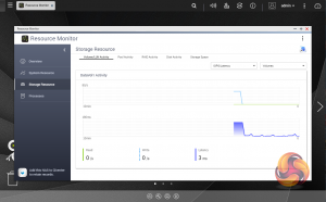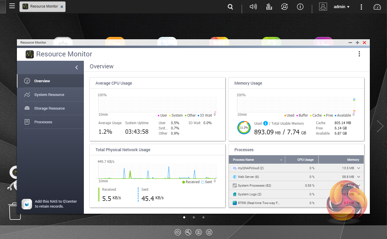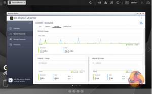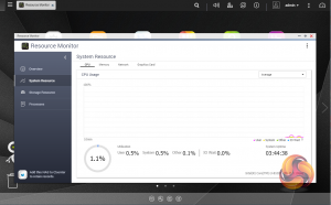 The Resource Monitor is a very useful tool, monitoring elements and offering detailed information on how the storage of the NAS is being used. It is divided into four sections; Overview, System (with separate tabs for the CPU, Memory and Network), Storage (with separate pages for pool, RAID and disk activities and how the storage space is being used) and Processes.