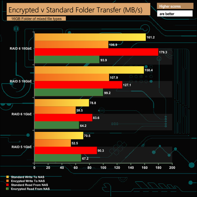 The TVS-872XT is much more efficient when writing encrypted data than reading and also appears to handle both encrypted read and write duties in a more balanced way with a 1GbE connection than when using a 10GbE connection.