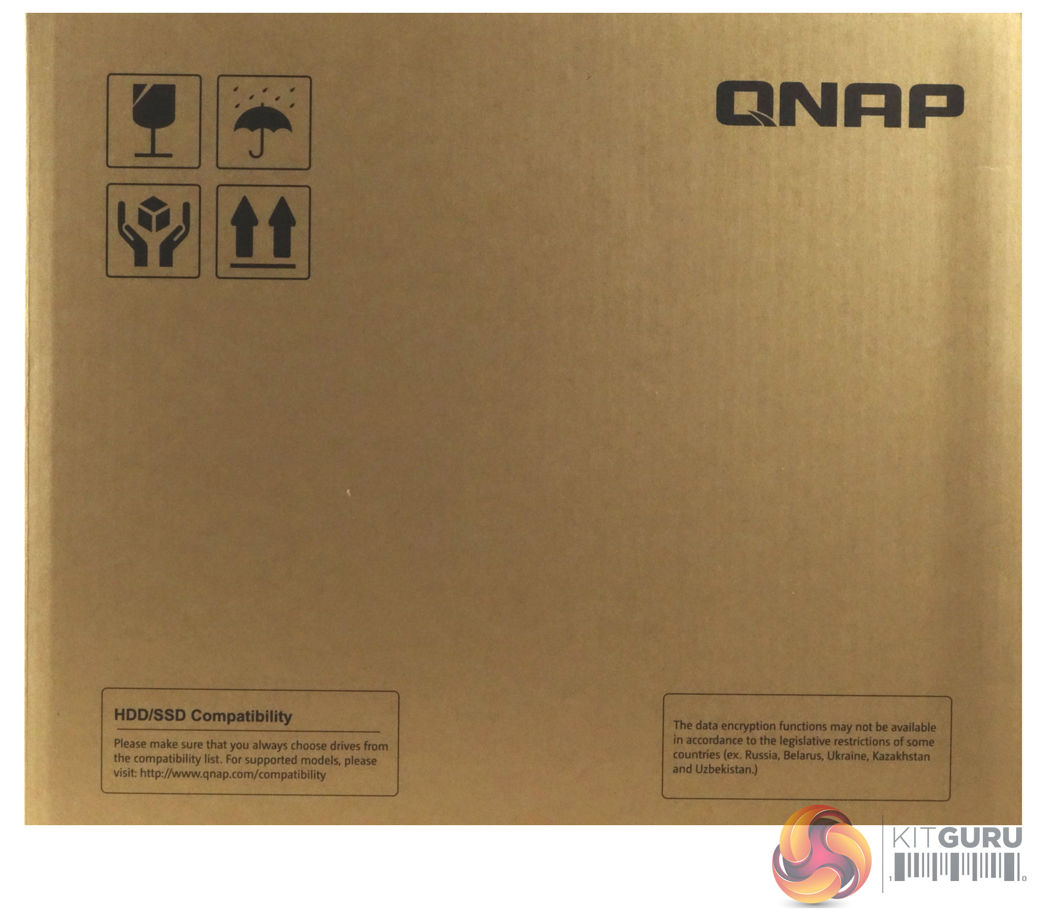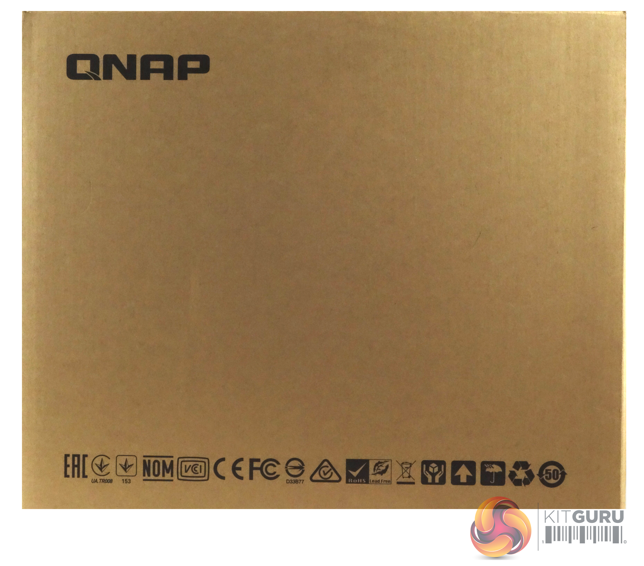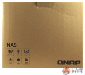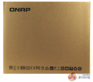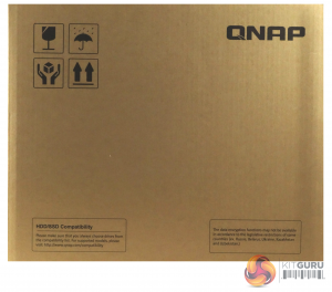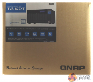 The TVS-872XT comes in a large box with a clear image of the unit on the front. Above the image to the right is a sticker which displays the amount of memory the NAS uses. Under the image there is a line of text describing some of the hardware features of the TVS-872XT.