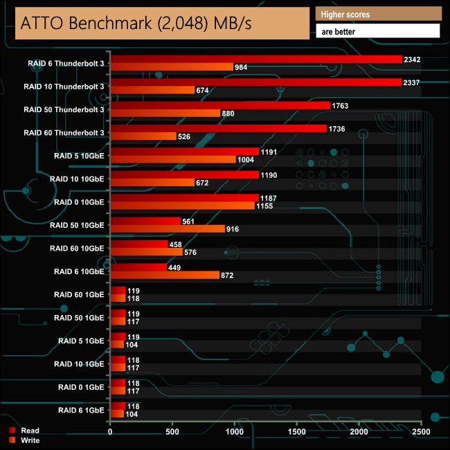 The fastest MB/s figure we got out of the TVS-872XT was 2,342MB/s for reads with the drives configured in a RAID 6 array and using a Thunderbolt 3 connection. However, the fastest write speed of 1,155MB/s came with the drives in a RAID 0 array using the 10GbE interface, while the fastest 10GbE read speed of 1,191MB/s came from a RAID 5 array.