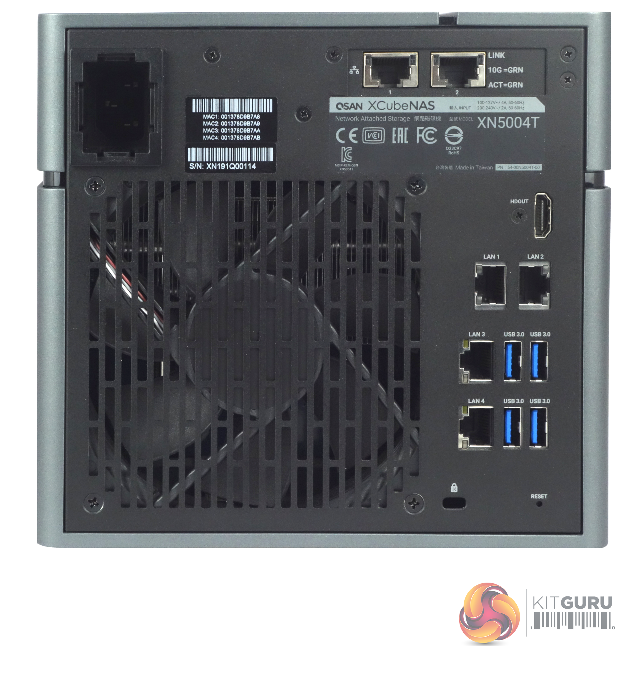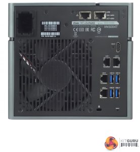 The rear panel is dominated by the grill for the 120mm system cooling fan. Above this is the deeply-set power in port, and to the right of this is the PCIe port external access (our review system came with a 10GbE card installed). To the right of the fan grill sit all the ports, all of which are vertically mounted. From top to bottom these are; HDMI, two 1GbE ports then another pair of 1GbE ports grouped together with four USB 3.0 ports.