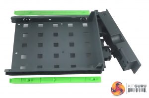 The four main storage drive trays are tool free, the hard drives being held in place by a pair of pinned plastic strips that fit into the drive tray's sides. The pins pass through the holes in the tray sides and into the mounting holes on the sides of the hard drive. If you want to use 2.5in drives in the main trays then you will need to use the provided screws.