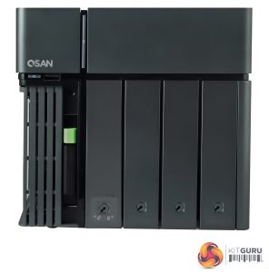 QSAN's XN50004T is a stylish looking and award winning NAS (the XCubeNAS won ‘Red Dot Award: Product Design 2019') and it certainly stands out from the usual grey/black business NAS boxes. The dark grey enclosure appears to have been divided into separate panels with gaps between the panels finished in a high gloss piano black, a simple enough idea, but it works very well. In the vertical gap between the front two top “sections” sits the long slimline power button. This button has an LED indicator built into it to show power and system status. Below the power button and next to the drive bays are the LED indicators for LAN and expansion unit status.