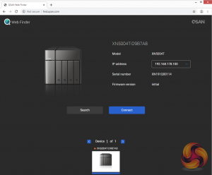 There are two ways to set up the XN5004T, either by using the WebFinder app or if there is a problem locating the NAS via the web interface, the Xfinder app which locates the NAS on the network. Clicking on connect in the web interface or double clicking the NAS on Xfinder brings up the first install/welcome page.