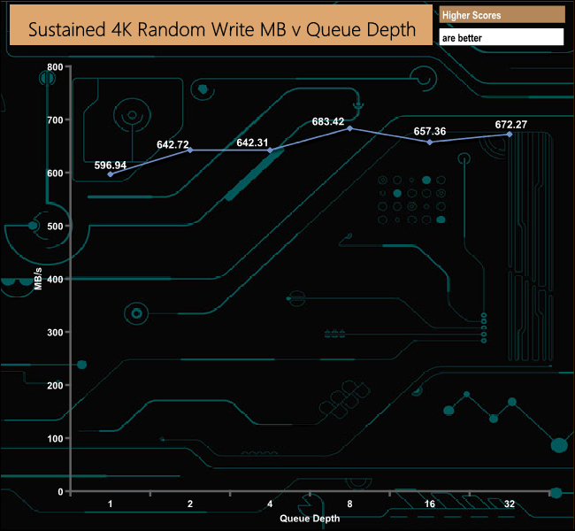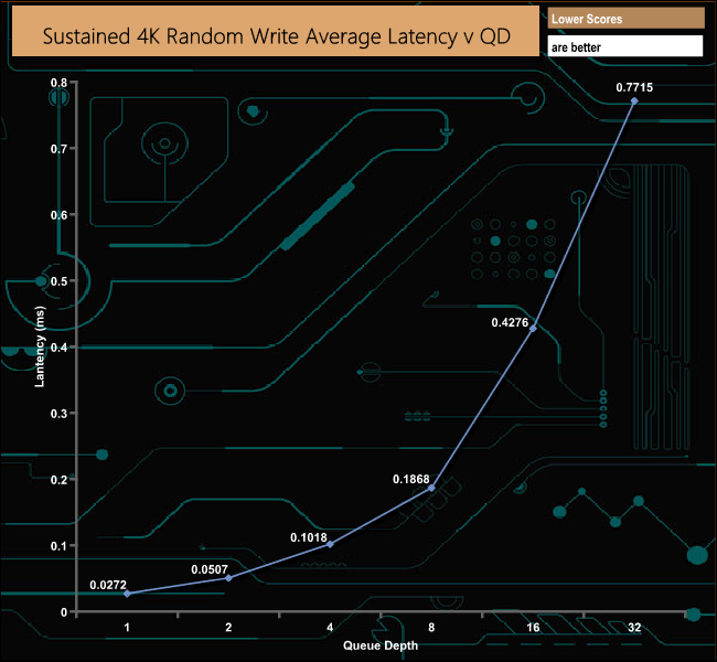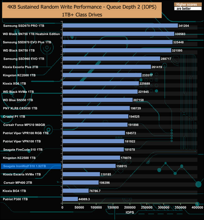 Compared to the drives around it, the strongest random write performance for the IronWolf 510 comes at a queue depth of 1.