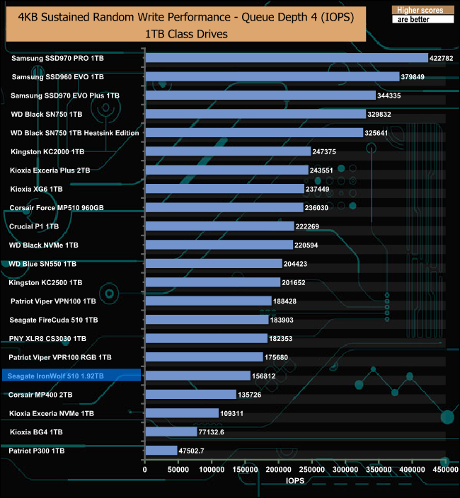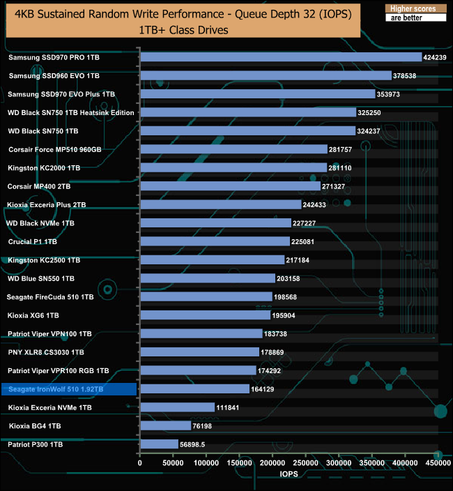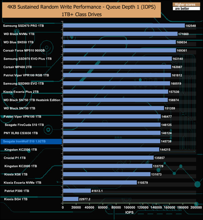 Officially the IronWolf is rated as up to 27,000 IOPS at a QD32 using 8 threads. With our 4-threading testing at a QD of 32, we exceed that by some margin, the review drive yielding a figure of 164,129 IOPS.