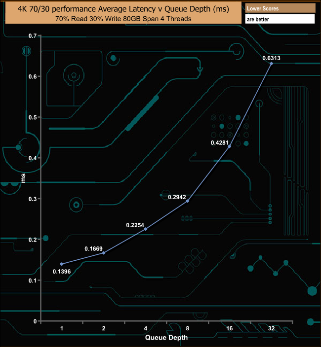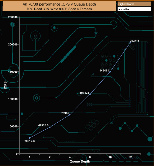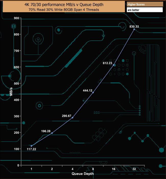 The drive performed well in our mixed 70/30 read/write tests, finishing the test at 202,718 IOPS (830.33MB/s).