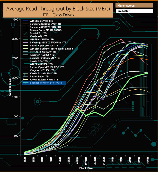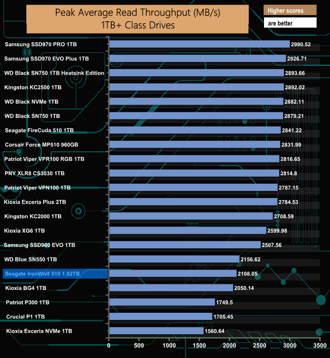 In our read throughput test, the IronWolf 510 peaked right at the end of the test run at 2,108MB/s.