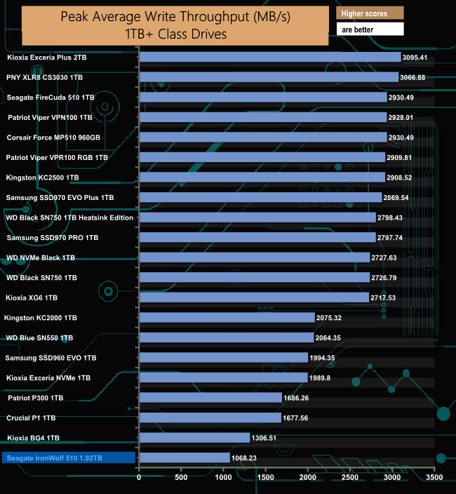 In the write throughput test, the IronWolf 510 peaked at the 4MB block mark at 1,068MB/s.