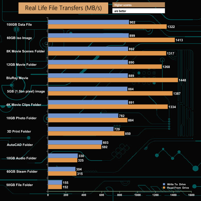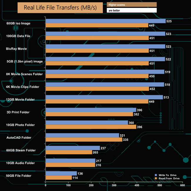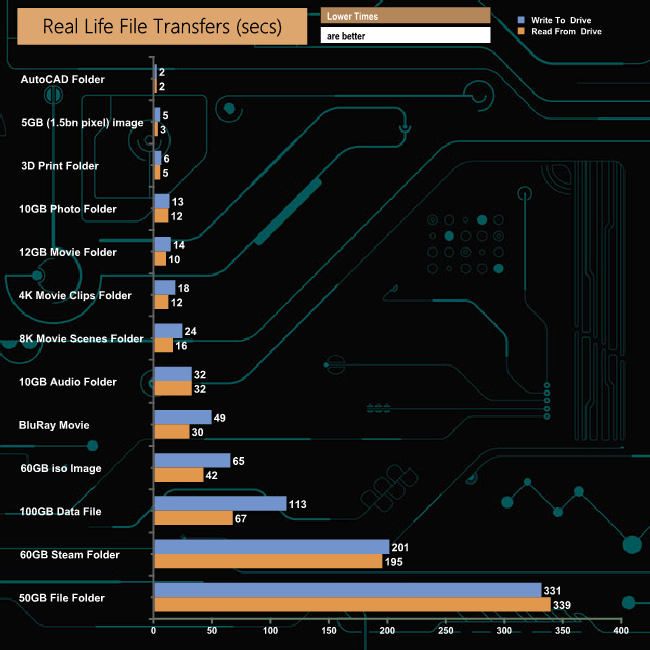 Transferring the files to and from another NVMe drive resulted in, as you might expect, huge improvements in file transfer speeds, especially when dealing with the larger file sizes.