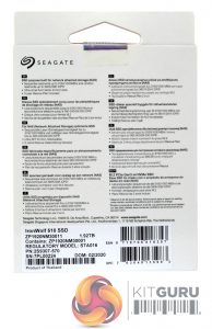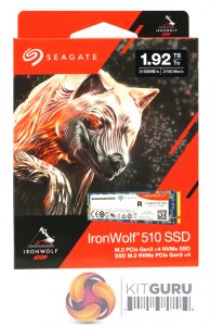 Seagate’s IronWolf 510 comes in a striking orange and white box with Seagate’s IronWolf wolf mascot prominently displayed along with a small image of the drive on the front. At the top of the box is a sticker which displays the drive’s capacity and the Sequential read speed of the drive. Towards the bottom of the box is some text displaying the interface of the drive.