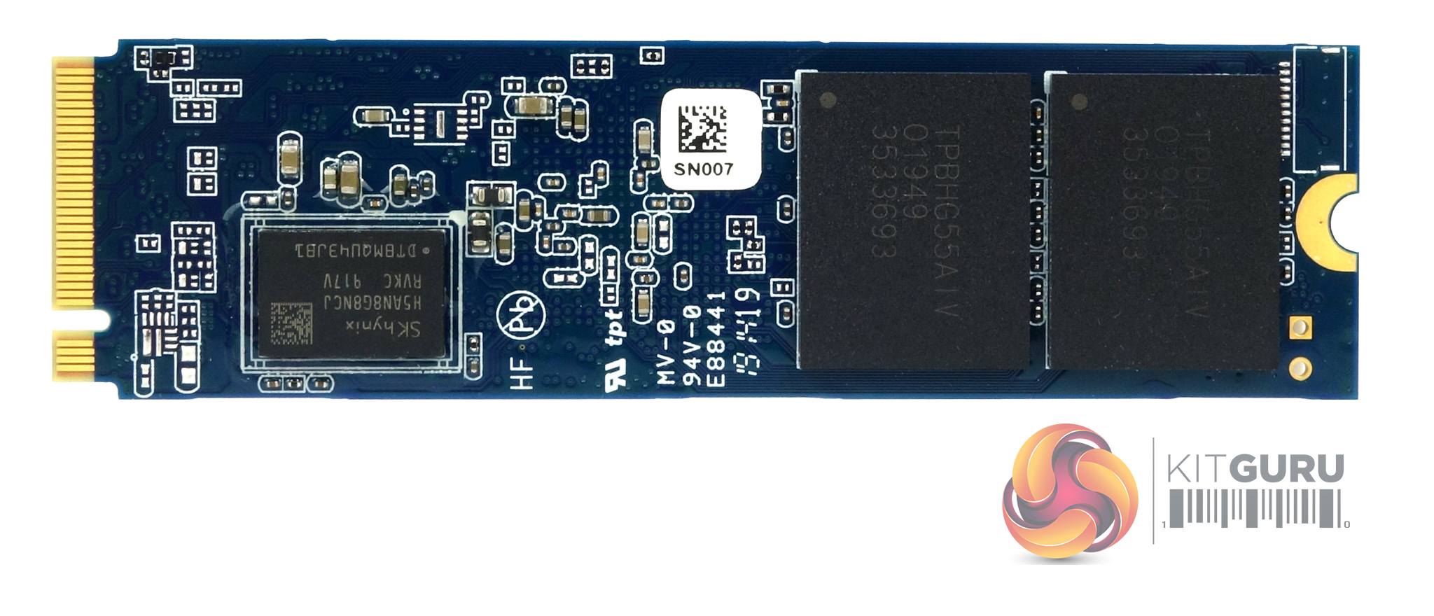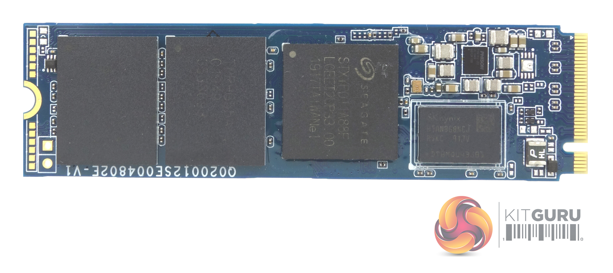 Sitting under the product label is the Phison PS5012-E12DC controller (branded as Seagate), alongside two packages of Kioxia BiCS3 64-layer 3D TLC NAND (coded TPBHG55AIV) and one DDR4 DRAM (SK hynix H5AN8G8NCJ) chip. On the other side of the PCB are two more NAND packages and a second DRAM IC.