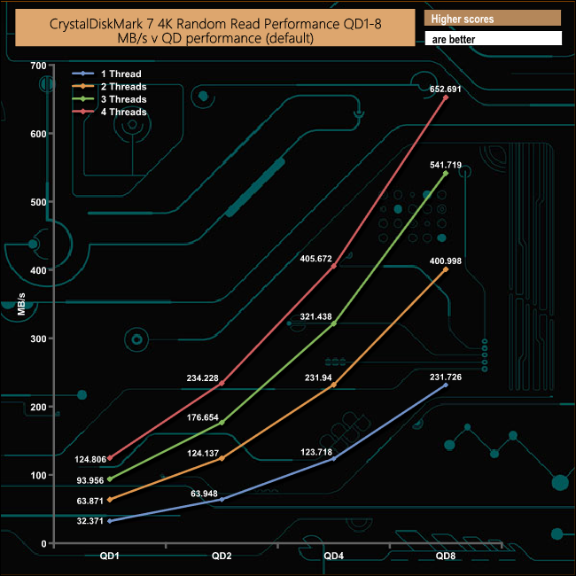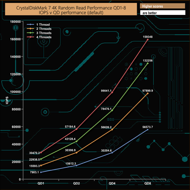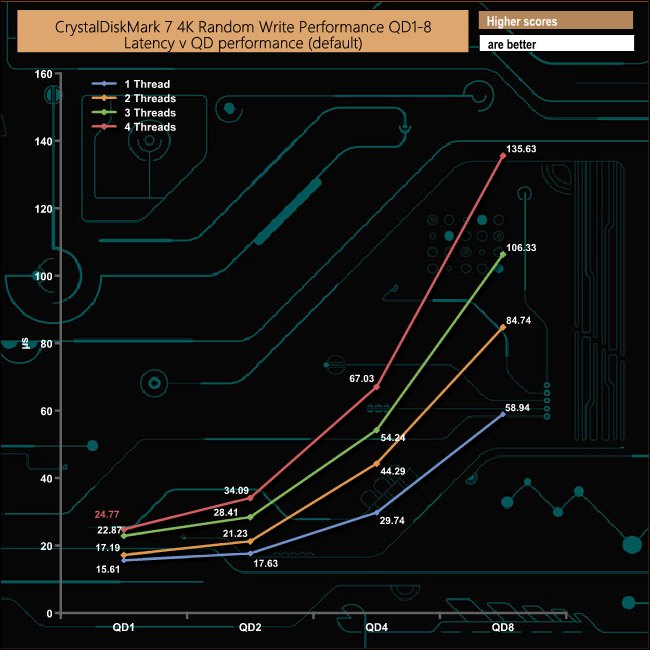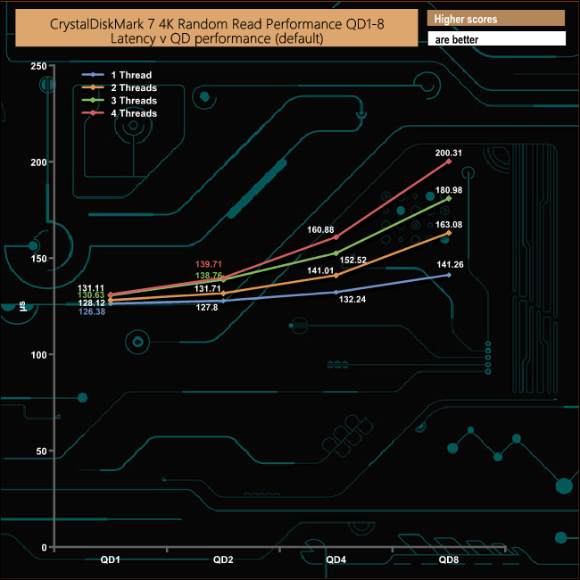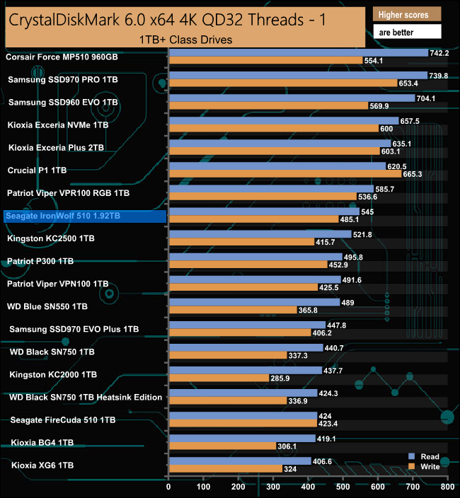 We also used CrystalDiskMark 7 to test the drive at lower queue depths (QD1 – QD8 where most of the everyday workloads occur) using 1 to 4 threads. The IronWolf 510's read performance climbs smoothly throughout the tested queue depths and threads.