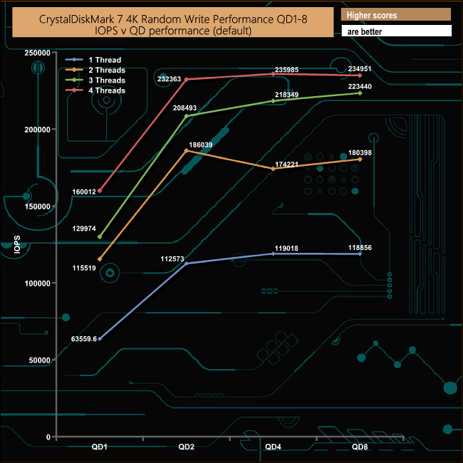 In the two-threaded test, the drive peaks at QD2 (186,039 IOPS) before dropping to 174,221 IOPS at QD4. At QD8 the drive had recovered to 180,398 IOPS.