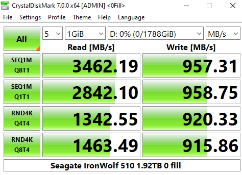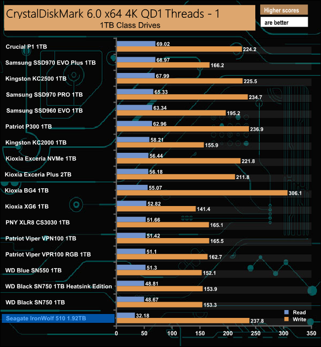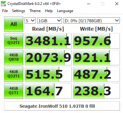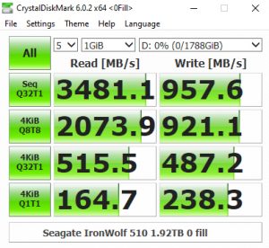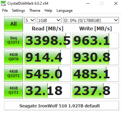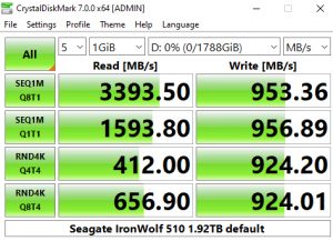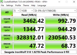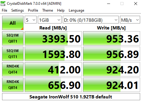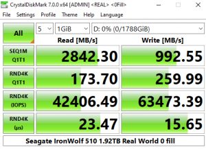The IronWolf 510 performs reasonably well in CrystalDiskMark’s deeper queue depth 4K test. From looking at the two benchmark result screens, it seems that the controller has a preference for handling compressible data. Using this type of data sees a big boost in the random read performance at queue depths 1 and 8.