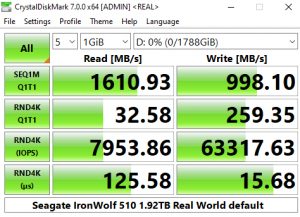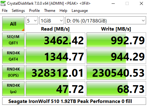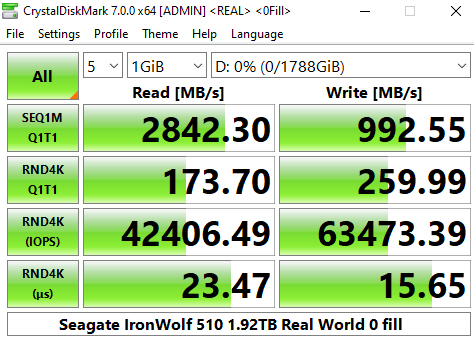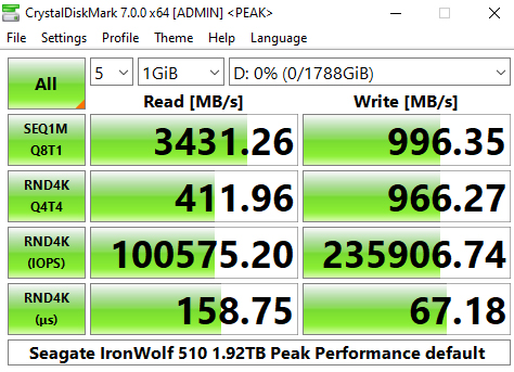The latest version of CrystalDiskMark, version 7, includes a couple of profiles that can be used for testing – Peak Performance and Real World. The result screens for these two profiles not only display MB/s results but also IOPS and latency.