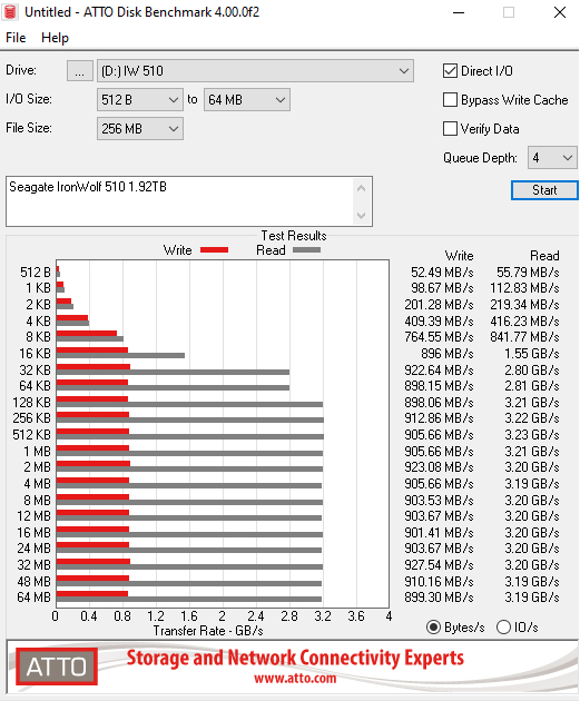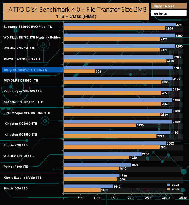 Officially the IronWolf 1.92TB is rated at up to 3,150MB/s for reads and 850MB/s for writes. We could confirm these figures with the ATTO benchmark, with our review drive producing a read figure of 3200MB/s and writes at 923MB/s, both being better than the official maximums.