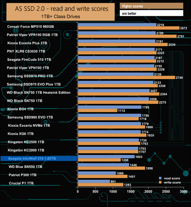 In the tougher AS-SSD test, the review drive doesn't reach the official 3,150MB/s, the review drive producing a figure of 2,805MB/s. However, the tested write score of 894.41MB/s is better than the official 850MB/s.