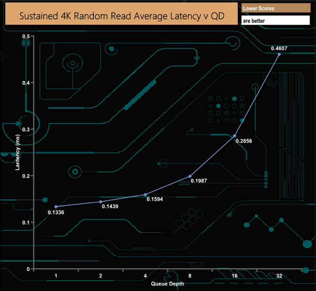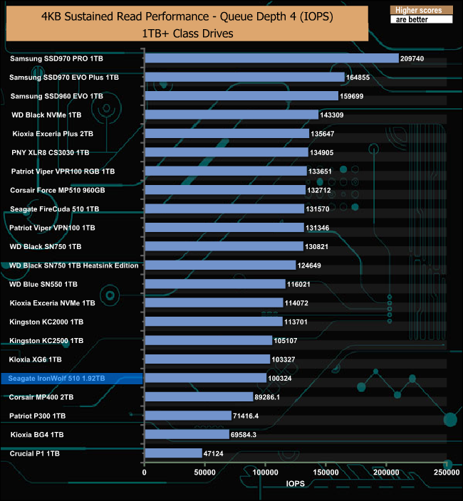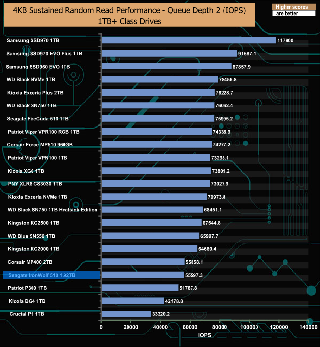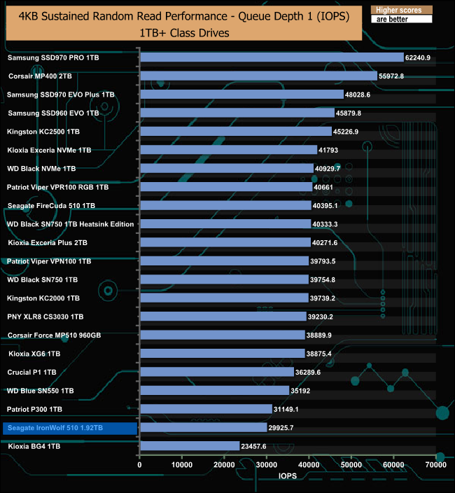 Throughout the tested queue depths, the IronWolf 510's random read performance sees it place in the bottom third of the results charts.