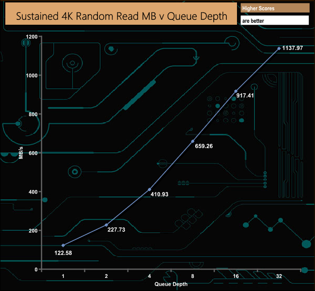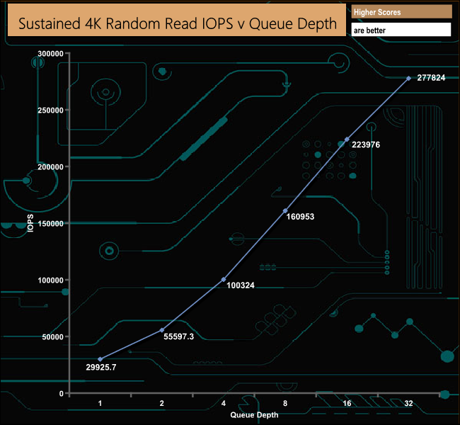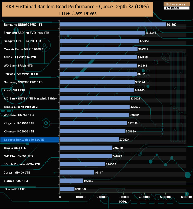 The IronWolf 510 is officially rated as up to 290,000 IOPS (QD32 8 threads) for random reads. With our standard 4-threaded tests we saw a figure of 277,824 IOPS at a QD of 32. We did a quick test at QD32 with 8 threads and got a figure of 345,030 IOPS, bettering the official figure.