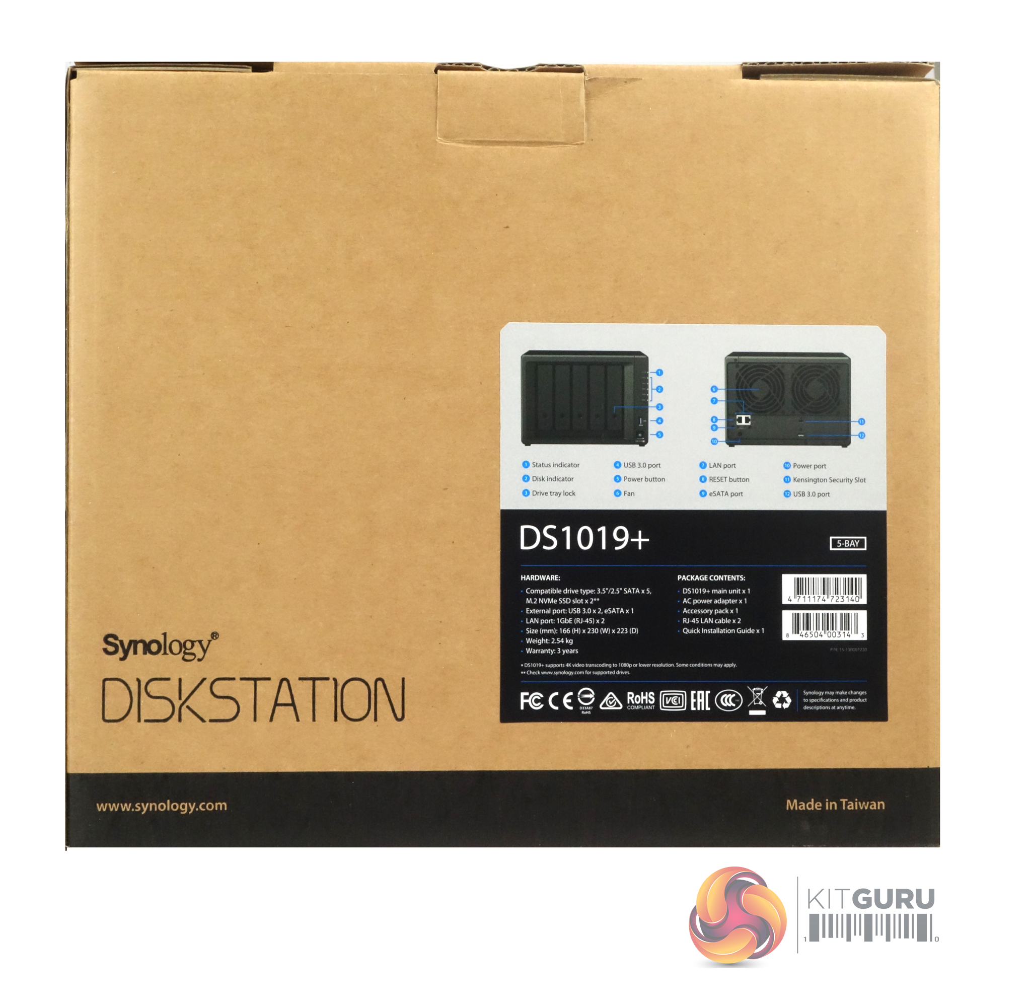 The rear of the box has a label in the bottom right-hand corner and this has front and rear images of the DS1019+ with spot points of the various ports and LEDS. Under this sits a hardware and box contents panel.