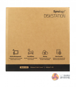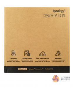 Both sides of the box have icons along the bottom showing some of the uses and features of the DS1019+; Mobile Management, Surveillance, Backup, Data Security, File Sharing, Anywhere Access, Cloud Sync and Multimedia.