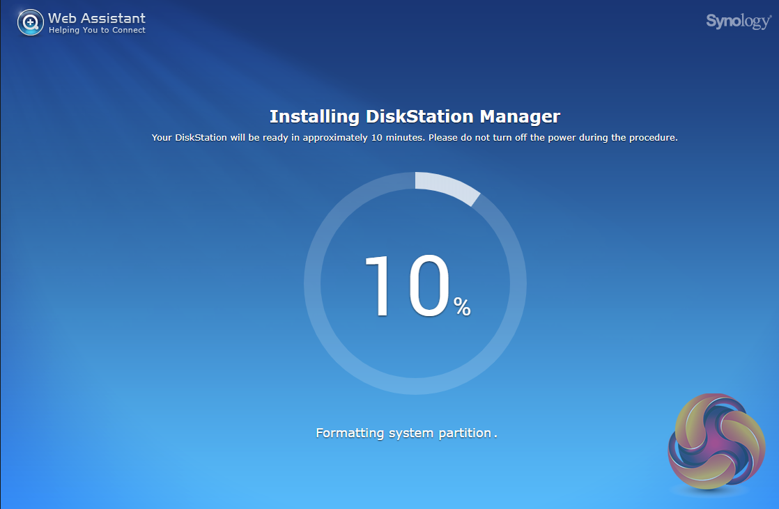 Once the NAS is found, the first window of the DSM setup wizard appears. Pressing install (there’s also a manual install option to install a downloaded instance of DSM) automatically downloads the latest version of DSM and starts installing it after reminding you that any data on the hard disks will be deleted.