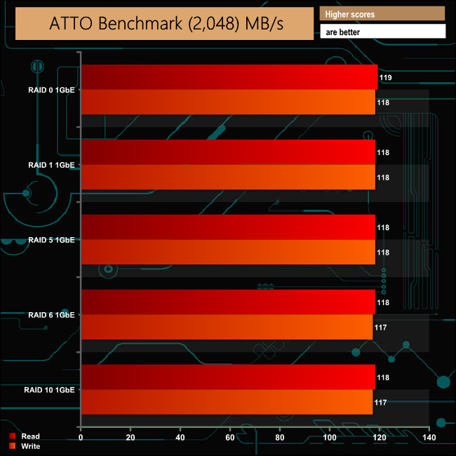 Synology quotes Sequential throughput performance for the DS1019+ as up to 226MB/s for reads and 222MB/s for writes but this is with both LAN ports being used in Link Aggregation mode. With a single Ethernet connection the read/write throughput figure of 118MB/s is what you would expect to see.