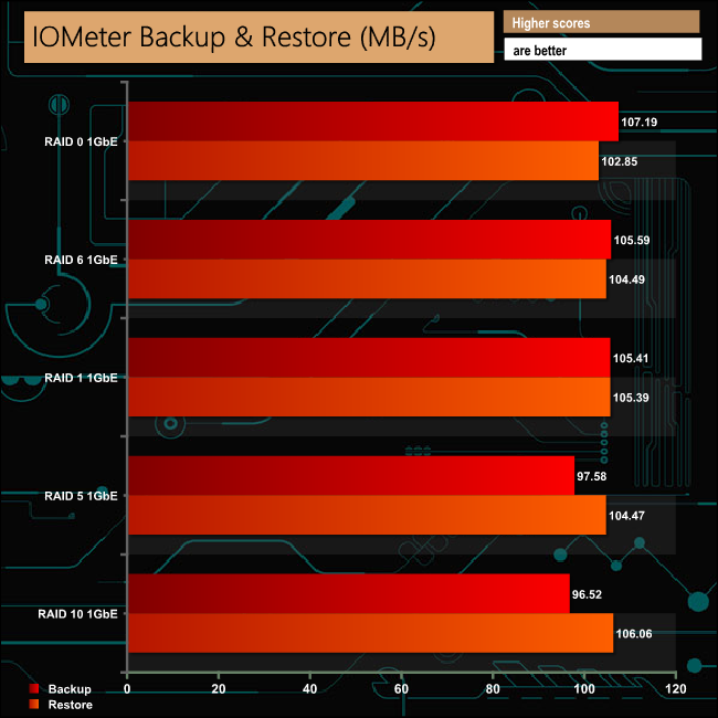 In our backup/restore tests, the DS1019+ averaged 102MB/s for backups across the five arrays tested and 104MB/s for restoring the data.