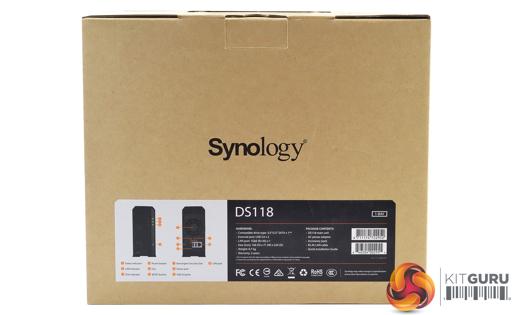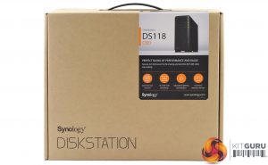 The DiskStation DS118 comes in a fairly compact box with a sticker in the top right hand side displaying a good clean image of the unit. Under the image are a row of icons describing some of its features; quad-cored CPU, 4K 10-bit H.265 transcoding, adjustable LED indicator brightness and the fact it uses Synology's DiskStation Manager.