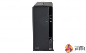 With only one drive to support, the DiskStation DS118 is a compact design. The enclosure is split in half lengthwise to enable access to the drive bay, with one side having a completely matt black finish while the other half has a shiny Piano Black front end to make it stand out as it holds the all the indicator lights and power button.
