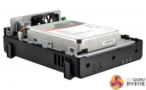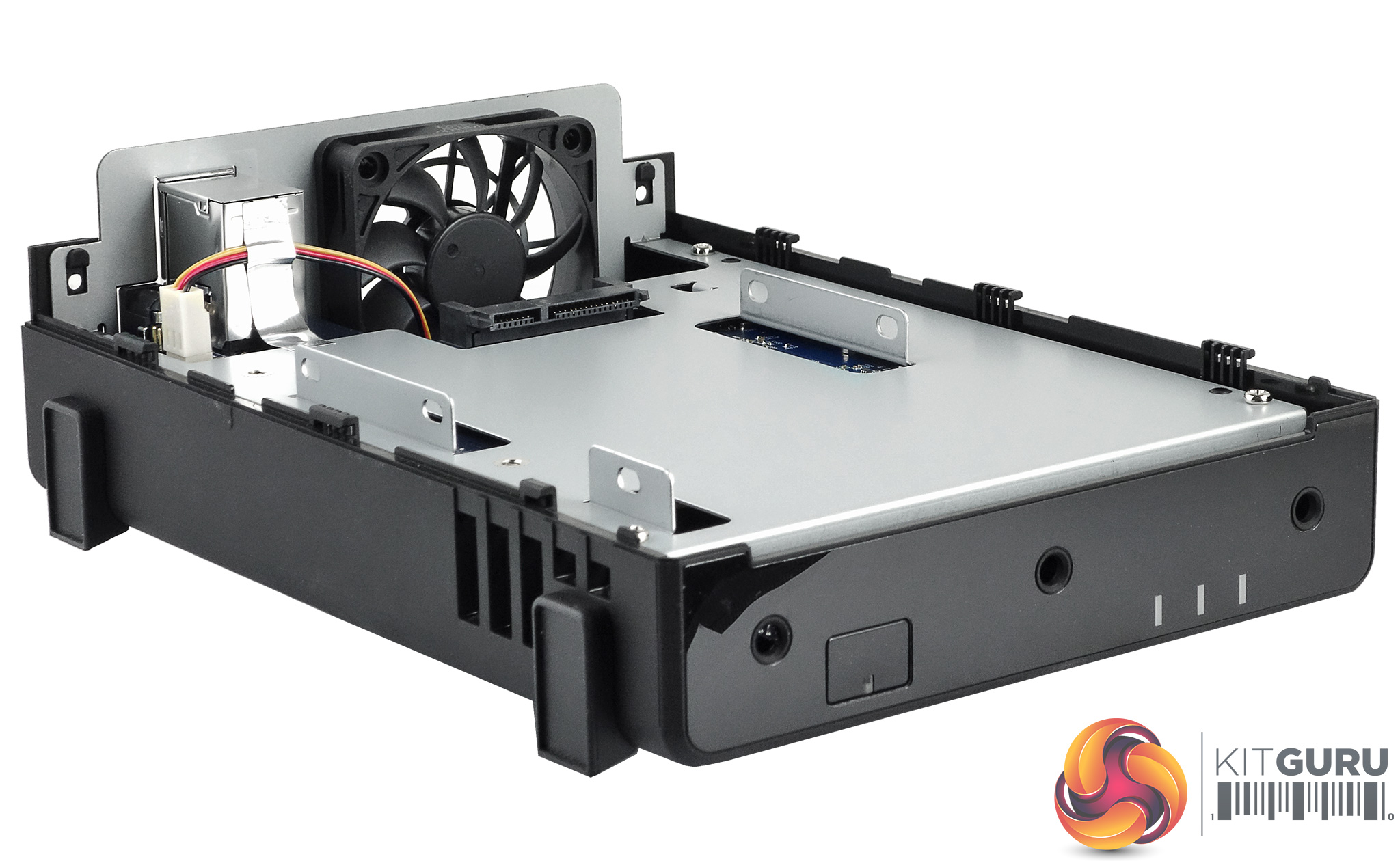 The two halves of the enclosure slide apart (there's a handy sticker under the case which shows which way to slide to unlock it) revealing the drive mounts. At the time of writing this review, the DS118 supports drives up to and including 12TB of capacity.