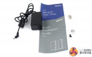 The box bundle for the DS118 is a simple affair; a 36W power adapter (EDAC EA1024PR), screws for securing both halves of the enclosure and for fixing the drive into position, a quick installation guide and a leaflet with an offer of a month's free trial of Synology's C2 Backup service.